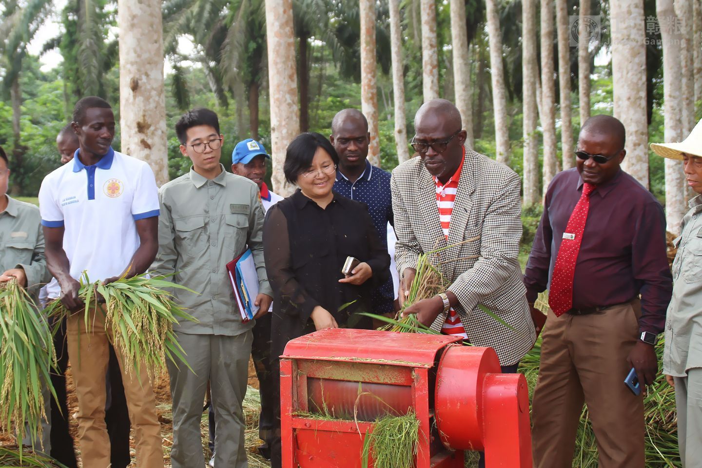 赤幾農(nóng)林部阿卡波部長親自進行水稻脫粒操作