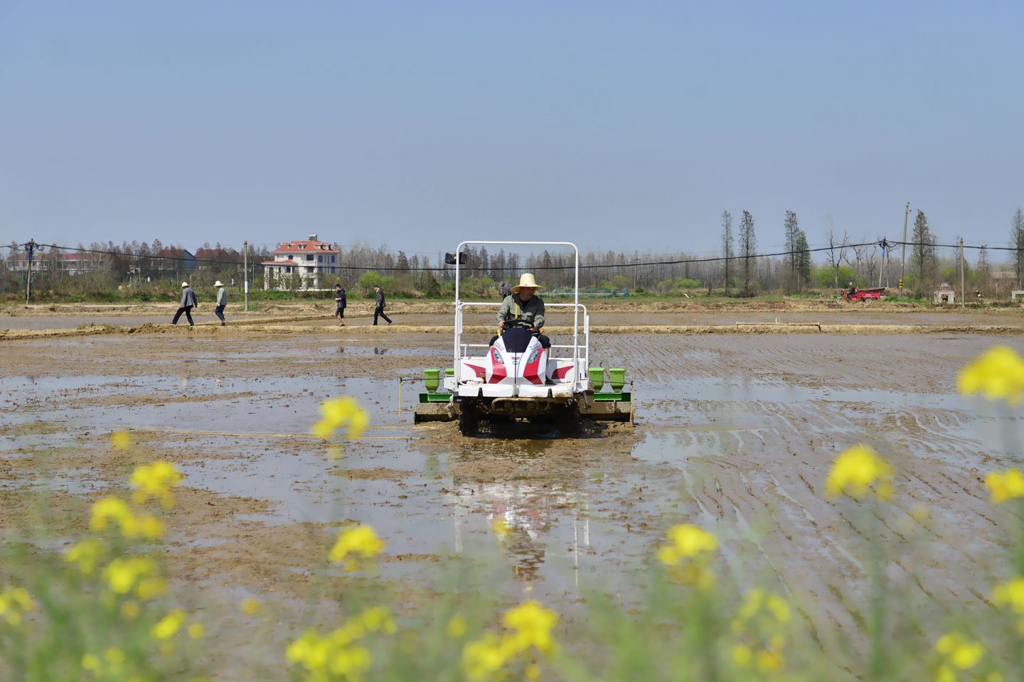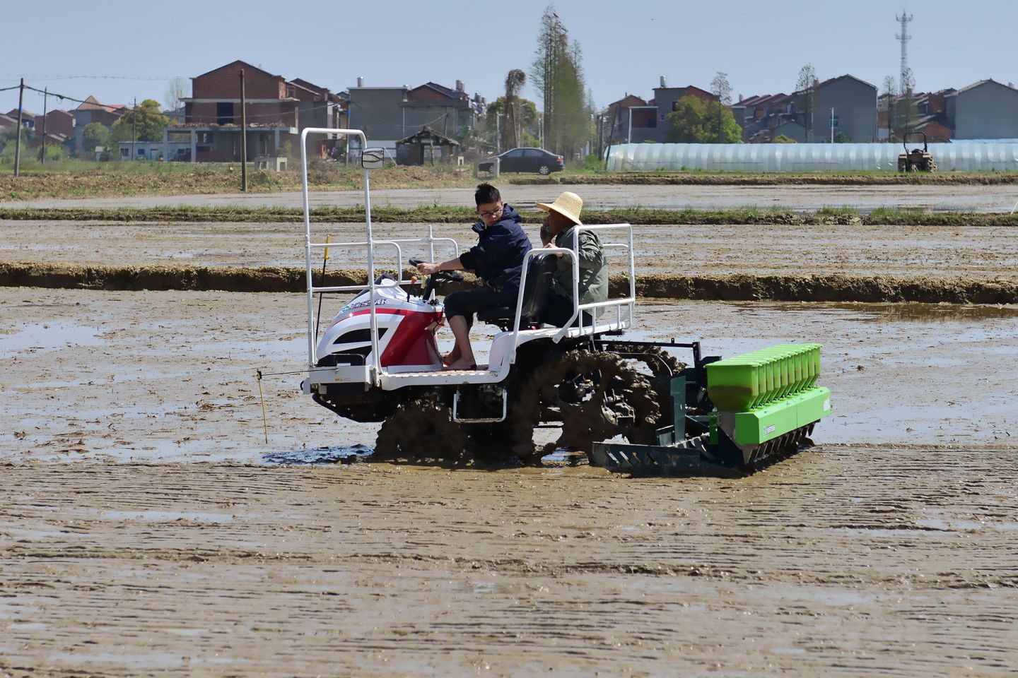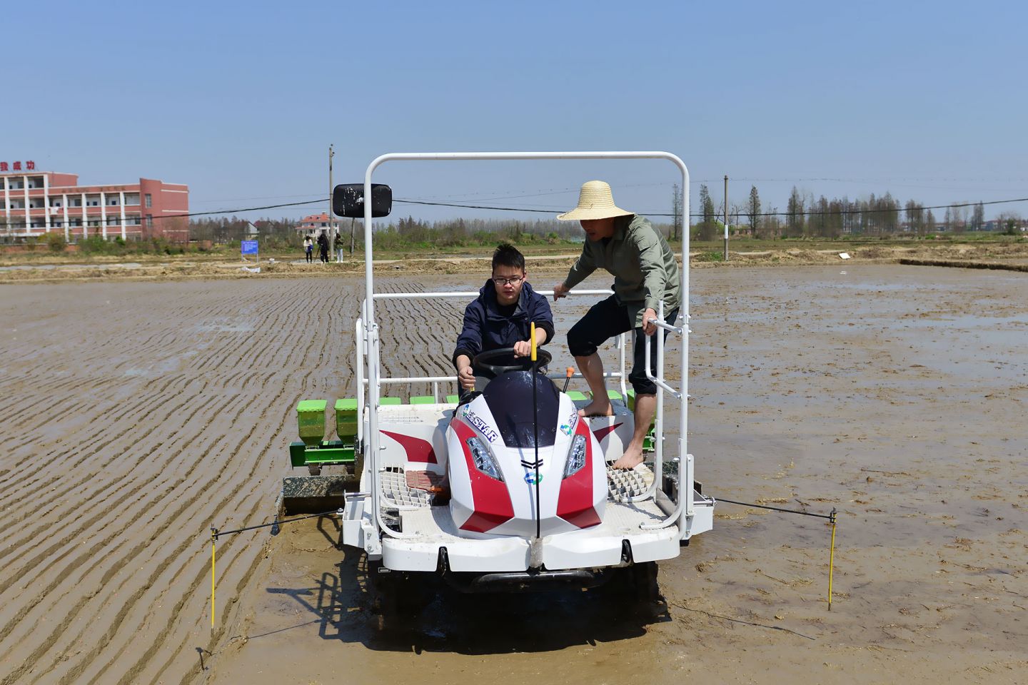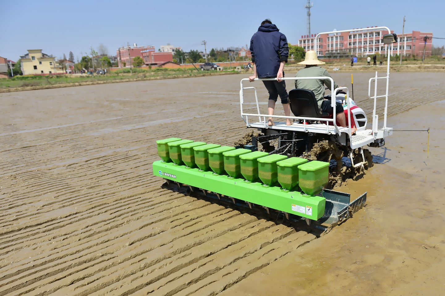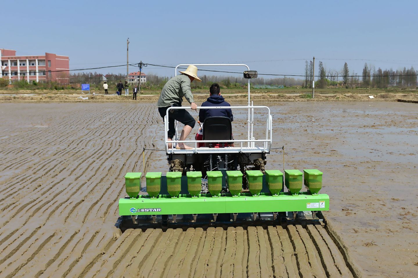 2021年3月25日,在南昌縣塔城鄉(xiāng)湖陂村再生稻示范點大田里傳來了陣陣轟鳴聲,原來是水稻精量穴直播機正在進行再生稻播種作業(yè)。這是江西贛糧院士工作站在南昌縣建立的第二個再生稻示范基地,示范大戶龔福旺,其面積200畝,示范品種為“豐兩優(yōu)香一號”。開啟了春耕春播忙,江西贛糧院士工作站把謝華安院士和羅錫文院士的最新技術(shù)成果引進應(yīng)用推廣,開展再生稻農(nóng)藝與農(nóng)機融合技術(shù)示范,為當(dāng)?shù)剞r(nóng)民種糧增產(chǎn)增效服務(wù)。在示范基地平整好的稻田里,我站劉平洲農(nóng)機手駕駛著直播機在田間來回穿梭,將破胸的種子均勻地分布在稻田里,形成了一條條起壟整齊的播種行,為再生稻高產(chǎn)創(chuàng)建打下良好基礎(chǔ)。