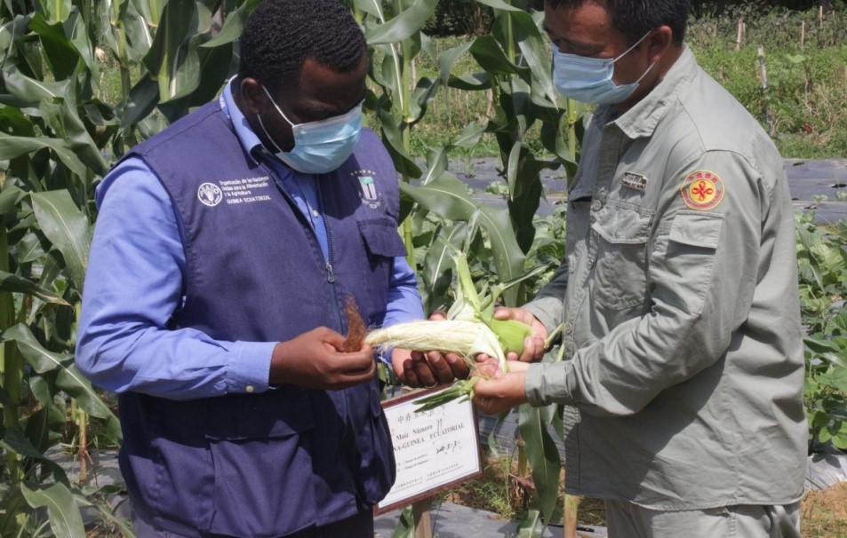 2021年5月12日,聯(lián)合國(guó)糧農(nóng)組織(FAO)駐赤道幾內(nèi)亞大陸地區(qū)負(fù)責(zé)人胡利安先生到示范農(nóng)場(chǎng)進(jìn)行參觀,項(xiàng)目組在室外接待了胡利安先生一行,在羅玉生專家的陪同下,胡利安先生一行先后參觀了蔬菜大棚、水稻種植區(qū)和玉米種植區(qū)等。