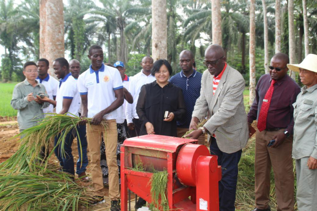 圖 赤幾農(nóng)林部阿卡波部長親自進行水稻脫粒操作