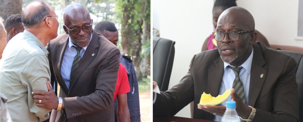 阿卡波部長與農(nóng)業(yè)專家陳大洲貼面問候 阿卡波部長品嘗黃囊西瓜